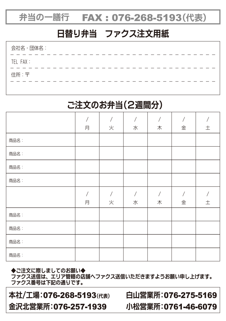 注文方法は、電話・FAX・注文書(メニュー表添付・書式ダウンロード)となります。